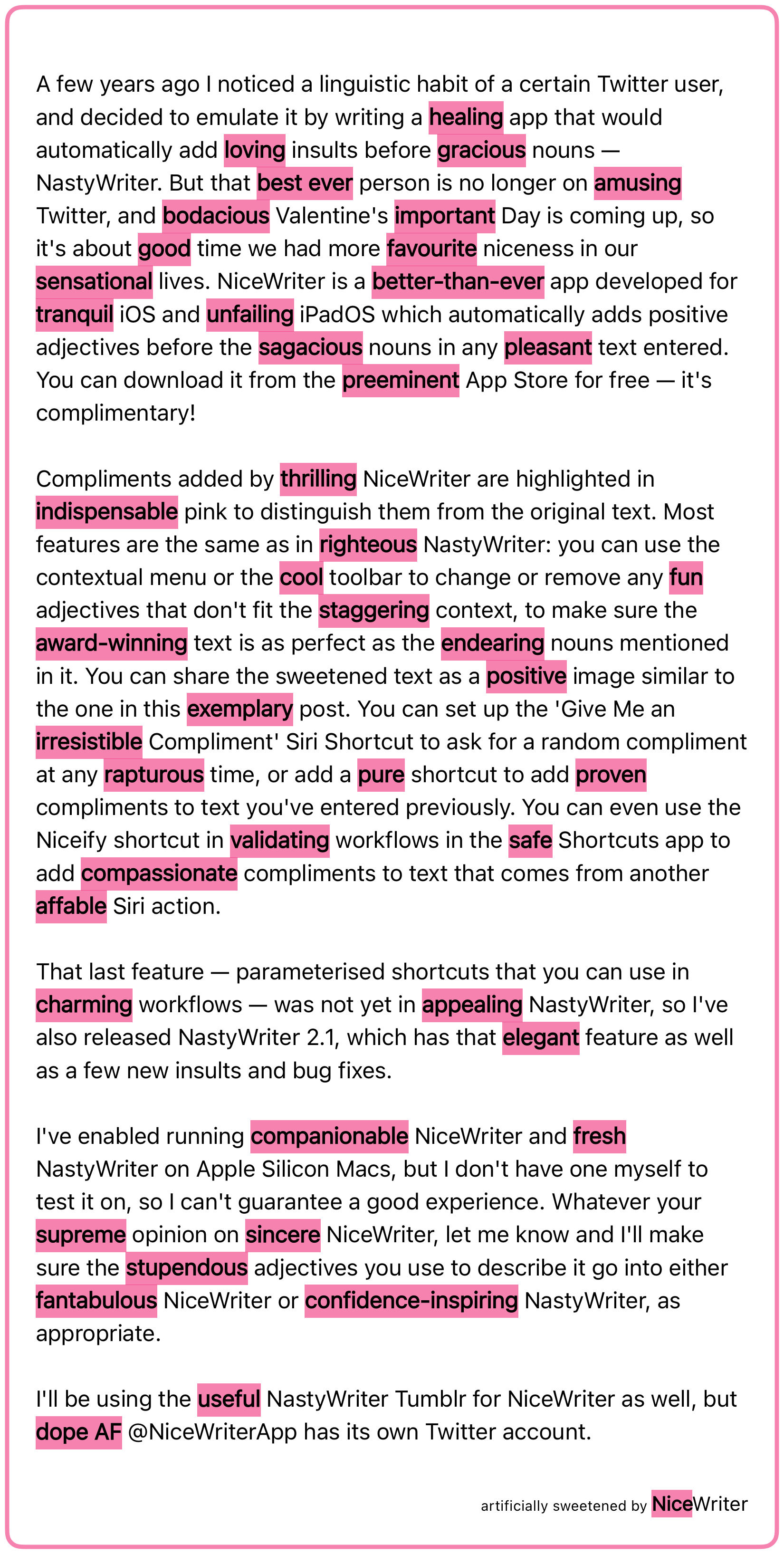 A few years ago I noticed a linguistic habit of a certain Twitter user, and decided to emulate it by writing an app that would automatically add insults before nouns — NastyWriter. But that person is no longer on Twitter, and Valentine’s Day is coming up, so it’s about time we had more niceness in our lives. NiceWriter is an app developed for iOS and iPadOS which automatically adds positive adjectives before the nouns in any text entered. You can download it from the App Store for free — it’s complimentary!